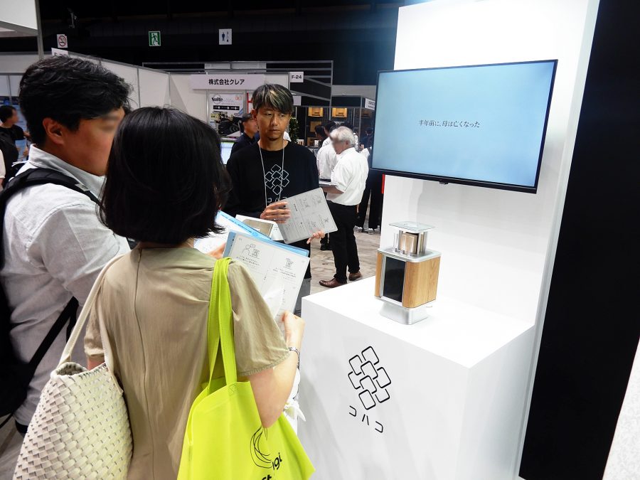 いま注目のAI(人工知能)を搭載した仏壇(アルファクラブ武蔵野㈱)も登場(写真上)。位牌を最大4柱まで格納し、仏前で故人の名前を呼び掛けると遺影が現れ、おりんの音を再生したり、命日や記念日など設定した日時にメッセージ動画・画像を再生することができます(遺品収納も可能)。人感センサーと音声認識機能により参拝者を判断し、最も共感できるコミュニケーションが取れるということです。今回出品したのは試作品で、最終調整後、来春の発売(35万円前後)が予定されています。
