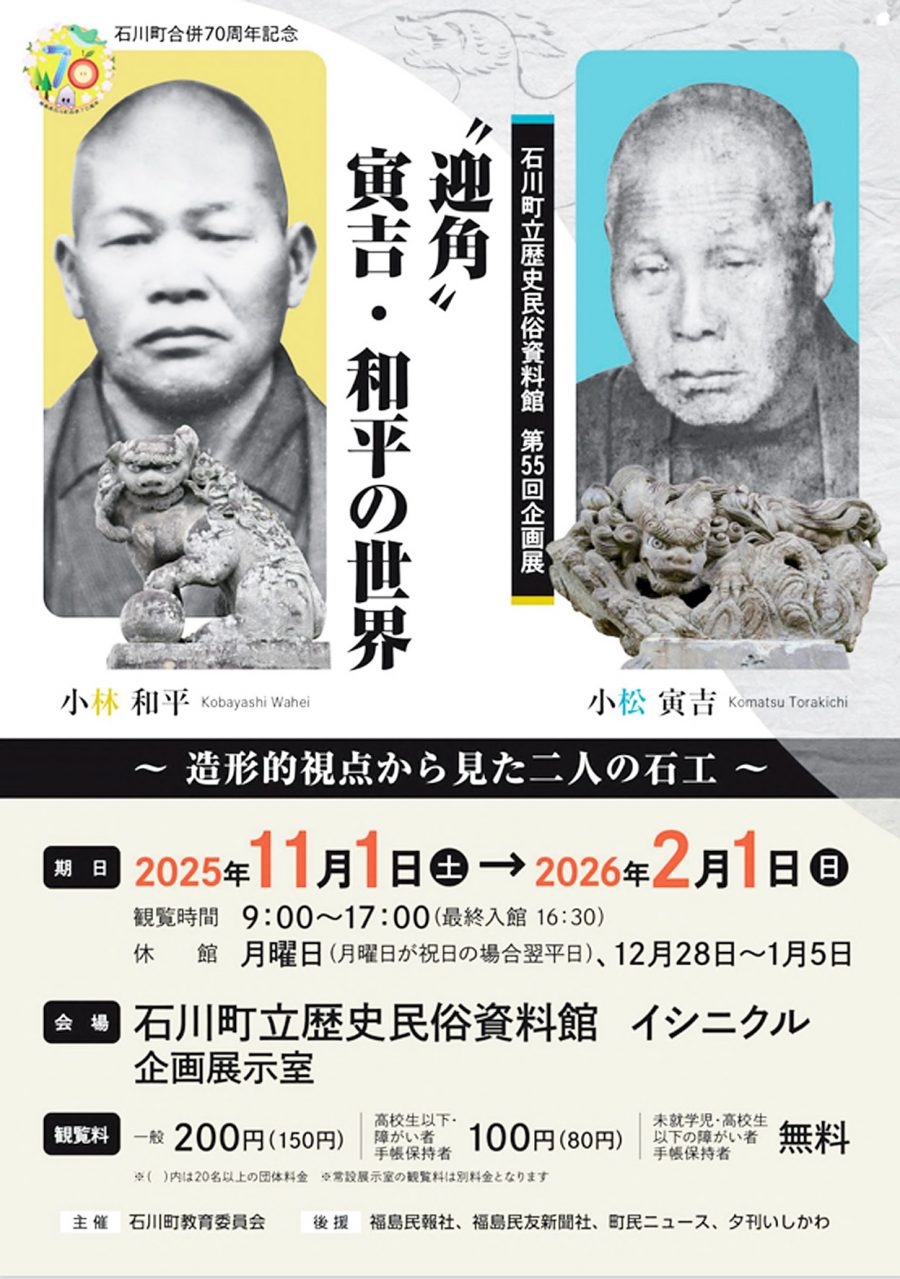 福島県南部にも雲の上を飛び跳ねるようなポーズ(飛び獅子型)でつくられた狛犬が各地にあり、「空飛ぶ狛犬」巡りが愛好家の間で密かなブームになっています。当地で活躍した有名な石工として、小松寅吉とその一番弟子の小林和平の名を挙げることができますが、その2人にスポットを当てた第55回企画展「“迎角”寅吉・和平の世界~造形的視点から見た二人の石工~」(写真上※URLあり)が来月2月1日㈰まで、福島県石川郡の石川町立歴史民俗博物館イシニクル開催されています。