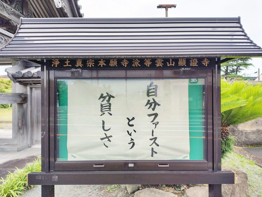 お寺の掲示板に書かれた心に残る言葉(仏の教えや人生訓など)を審査・表彰する「輝け!お寺の掲示板大賞2025」の受賞作が決定しました。公益財団法人仏教伝道協会が主催する恒例企画(本コラムでは2022年12月19日付け、2025年1月20日付けで既報)で、昨年2025年の大賞は「自分ファーストという貧しさ」(鹿児島県南さつま市、顯證寺=写真上)に決まりました。この法語を考案・掲示したのは、同寺で住職を補佐する坊守(ぼうもり)を務める藤かおりさん(50)。「自分の幸せを追求するあまり、煩悩と分断が連鎖した(他者を尊ばない)貧しい社会になってしまうのではないか」という不安や危機感を表現した作品です。本企画の公式サイトでは「仏教の教えをまず自分事として捉えることは重要ですが、仏教の慈悲の精神においては、必ずしも自分がファーストではありません。人々が他者への思いやりを持った寛容性豊かな社会になることを願って(大賞に選んだ)」とコメント(講評)を掲載しています。